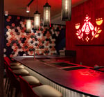 Qu’importe votre humeur, l’atmosphère a l’énergie suffisante pour vous mettre à l’aise, grâce à une lumière romantique qui procure exclusivité et intimité que vous soyez assis au bar ou à une table du restaurant. On s’immerge dans un espace au revêtement boisé ou peint d’un bleu marine royal, tandis que le coin du bar se définit par une dominance de rouge grâce à un cadre lumineux projetant l’emblème graphique et hypnotique d’une abeille.