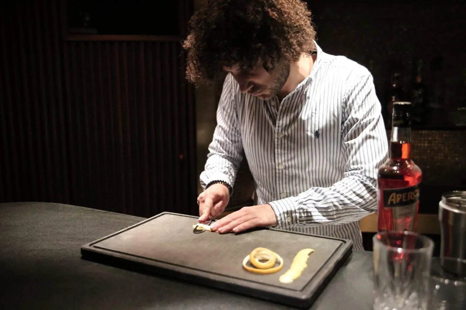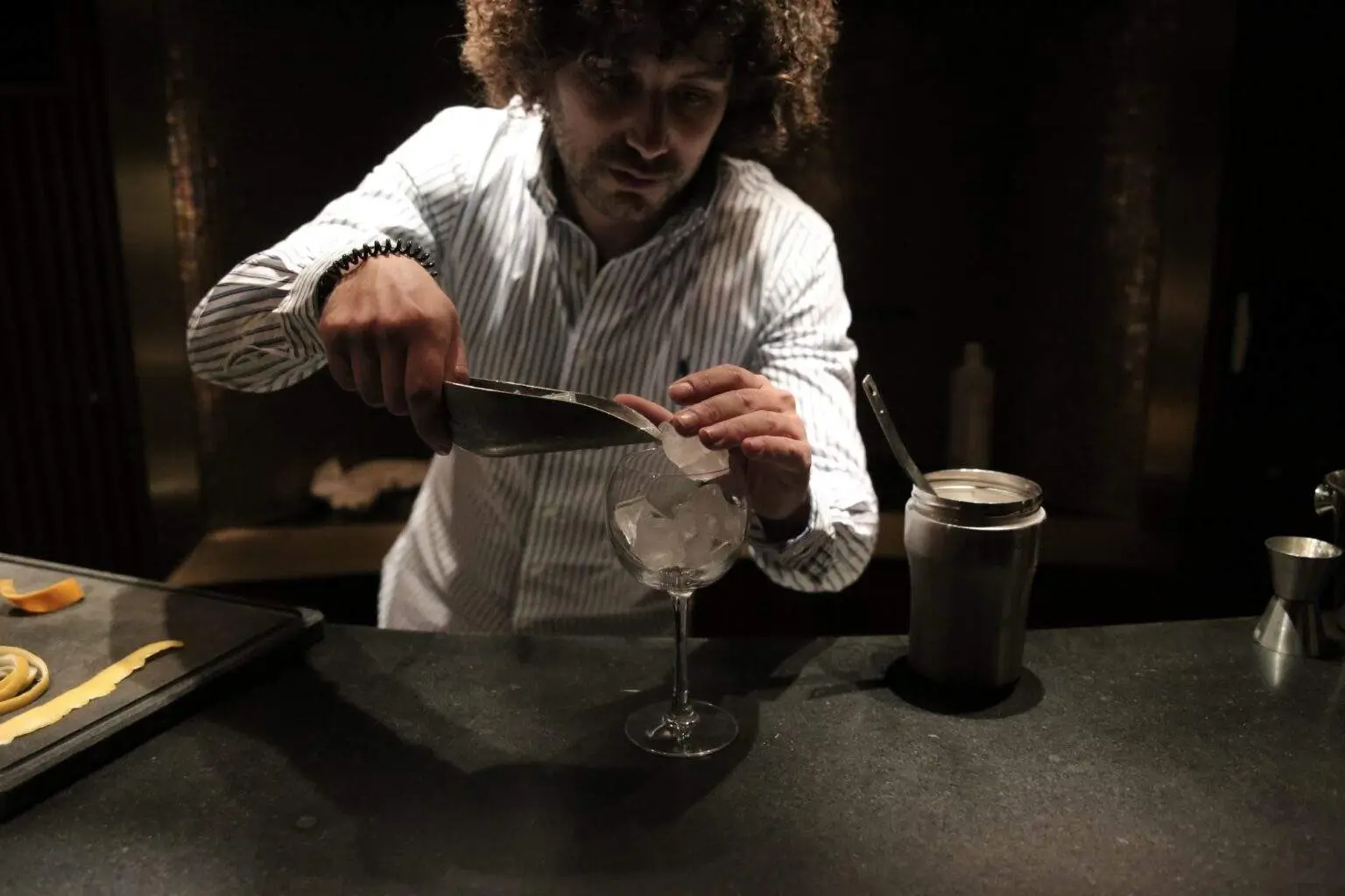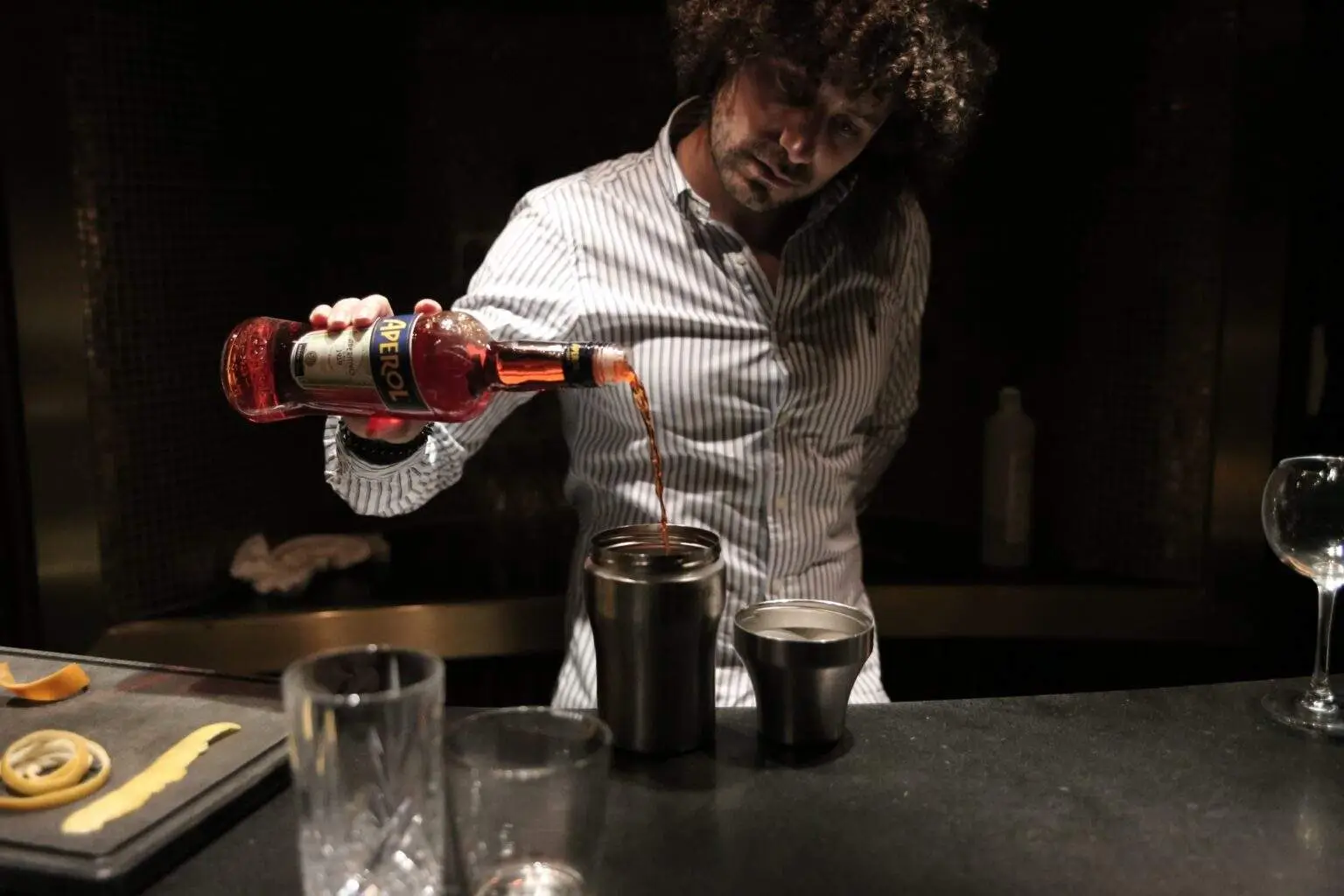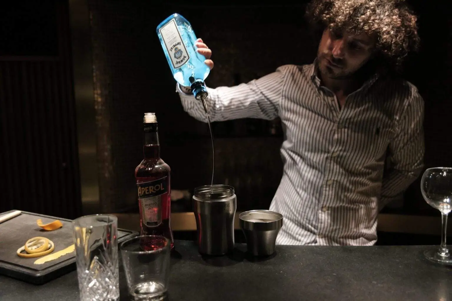 Dans un shaker, versez 3 cl de gin Bombay Sapphir et 4 cl d'Aperol (ou Campari).